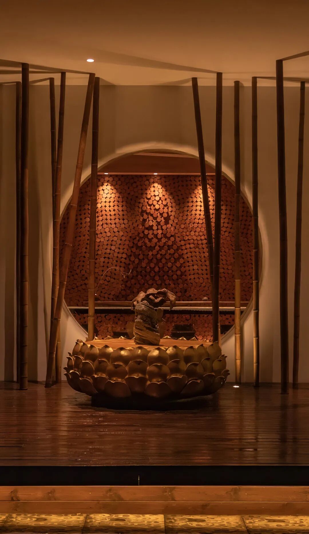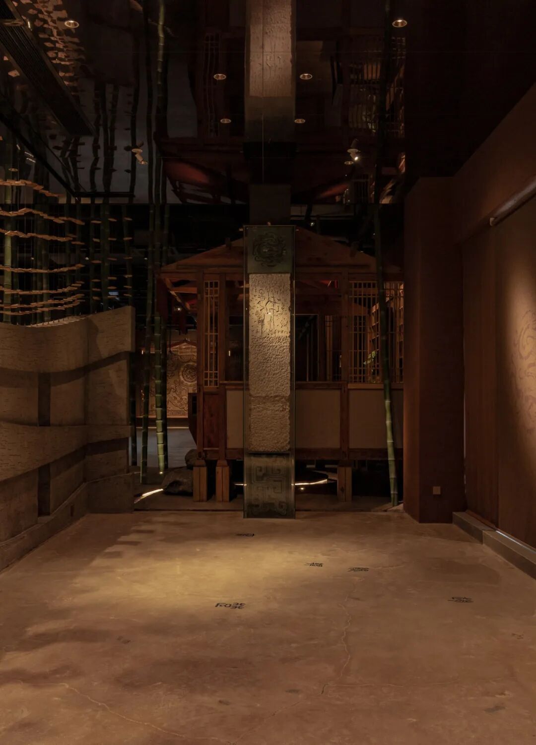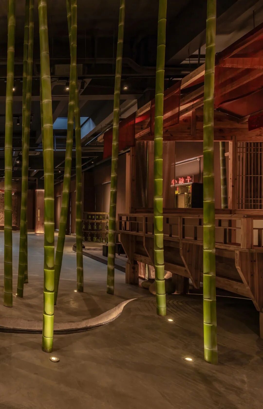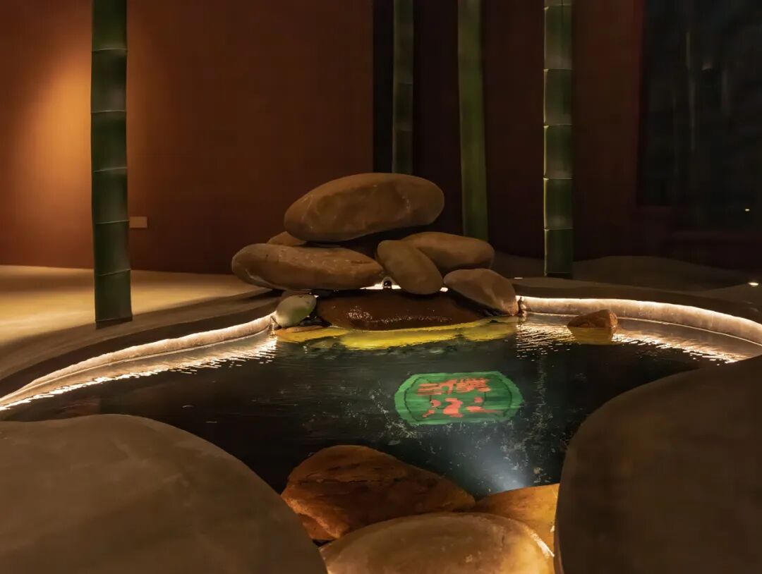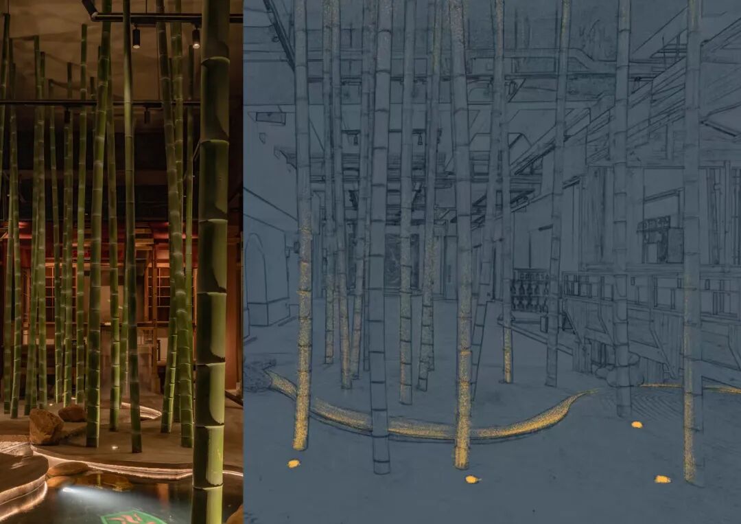 竹林以“濮水濠梁”为灵感,名之曰“濠濮间想”,空间呈现“智者乐水”之形象。“竹林”作为一个空间隔断,埋地灯打亮竹林,营造一个过渡的灯光氛围,潺潺水流,柔和灯光,动静结合。