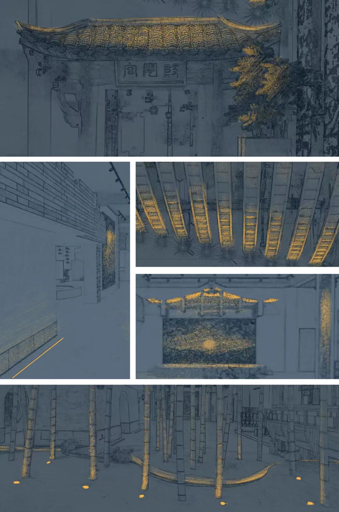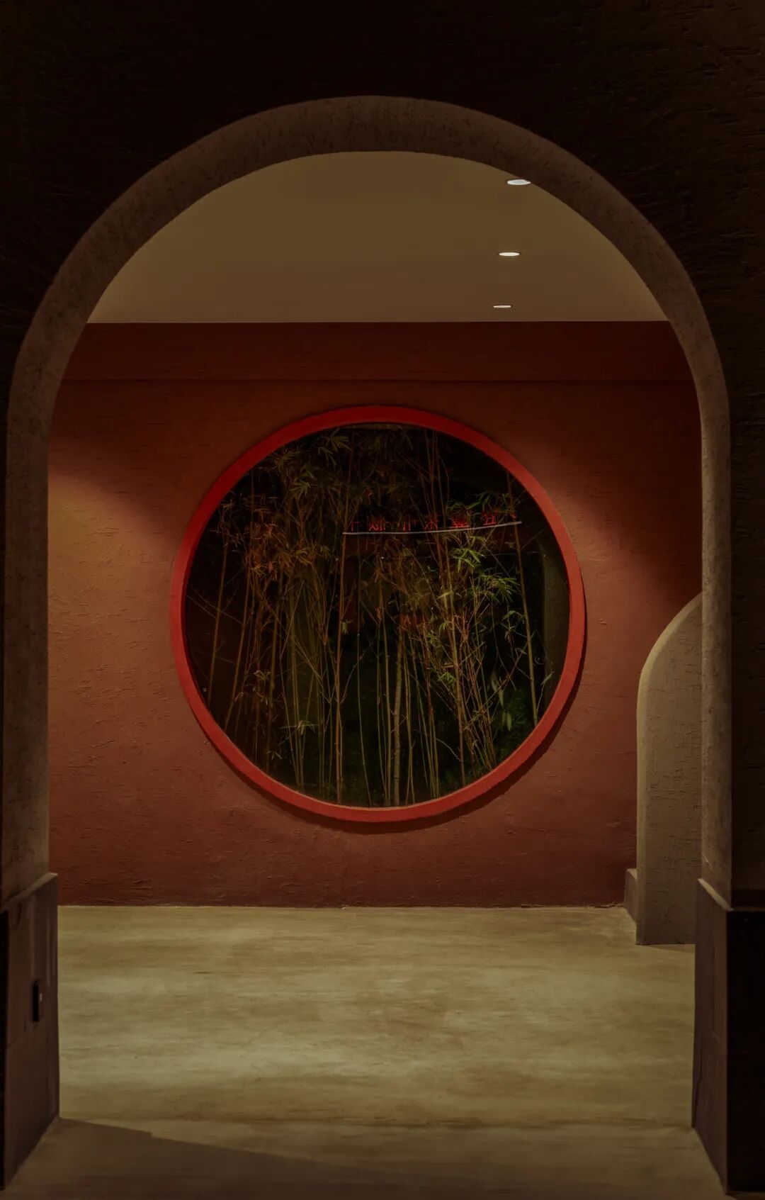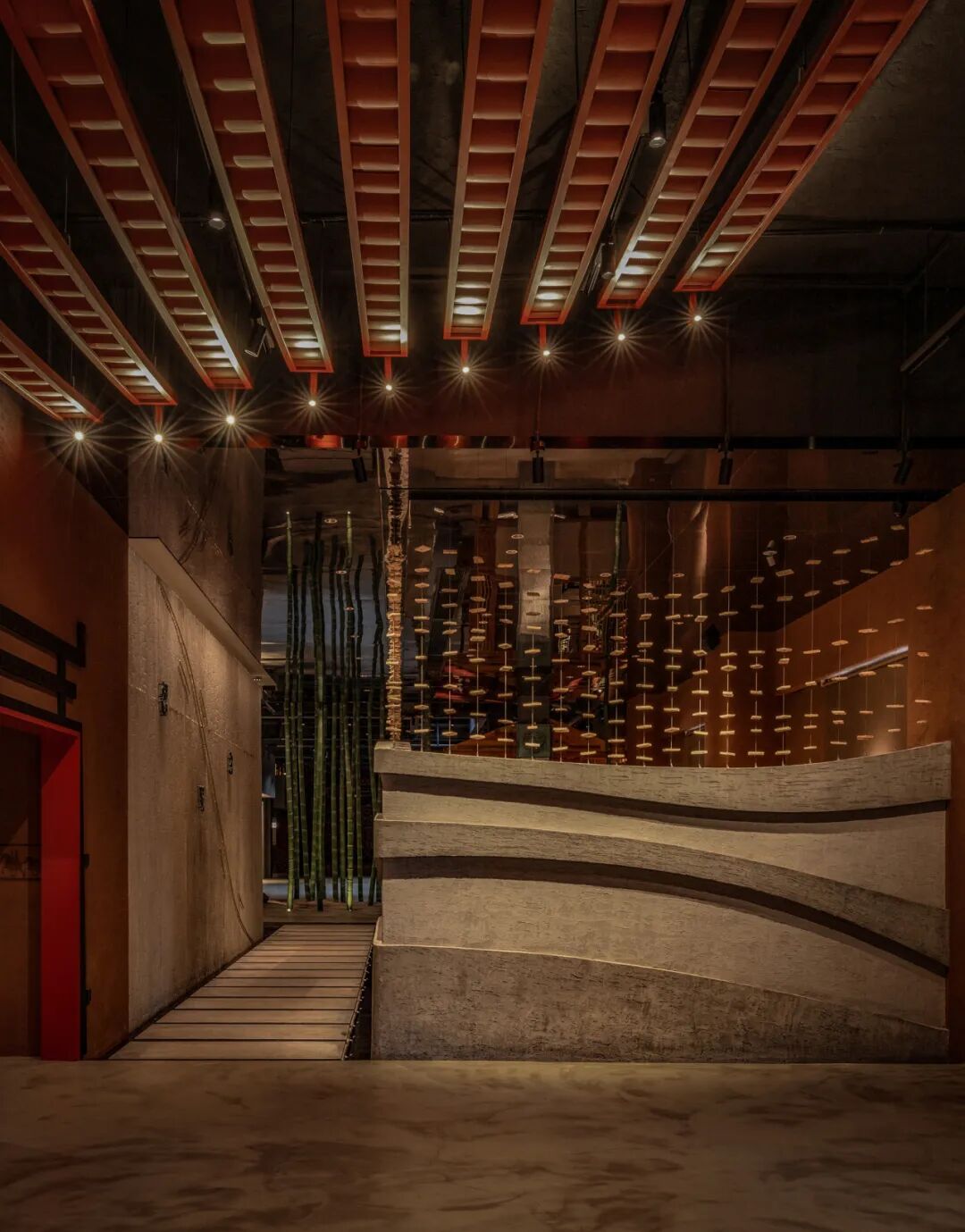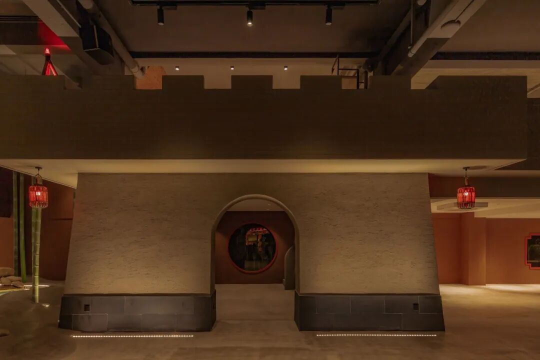 竹林以“濮水濠梁”为灵感,名之曰“濠濮间想”,空间呈现“智者乐水”之形象。“竹林”作为一个空间隔断,埋地灯打亮竹林,营造一个过渡的灯光氛围,潺潺水流,柔和灯光,动静结合。