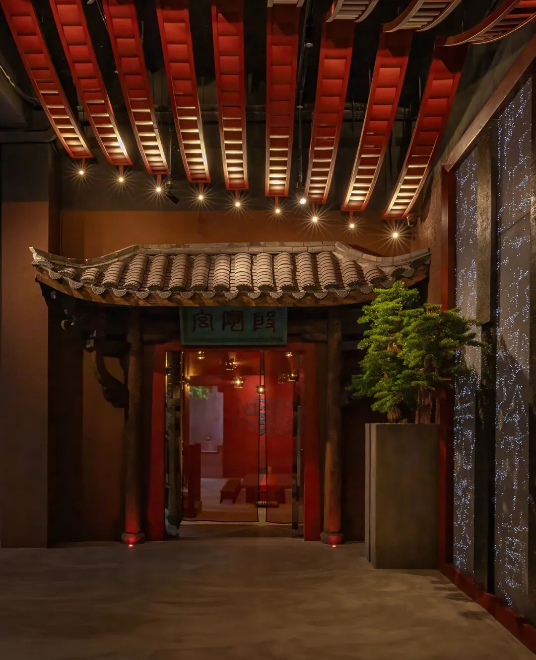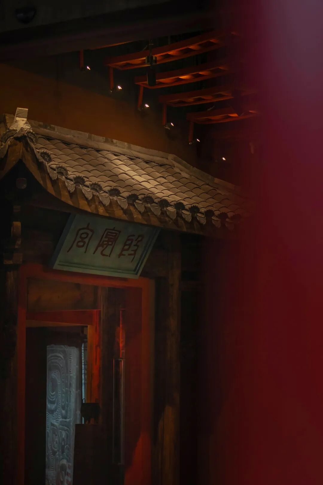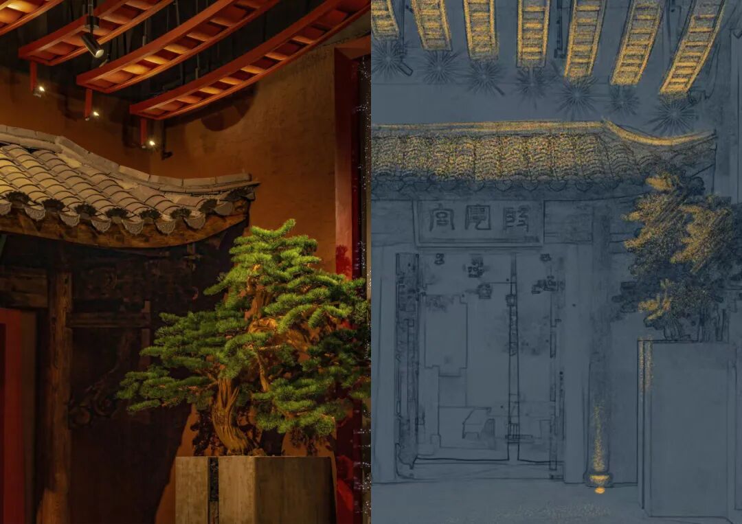 大堂区域的屋顶展示中国传统古建之美,从传统屋顶提取元素,屋脊结构造型喻义户外殿堂。在迎客松的位置,我们用精准调节角度和配光的导轨灯进行照明,突出‘山水之间’的意境。