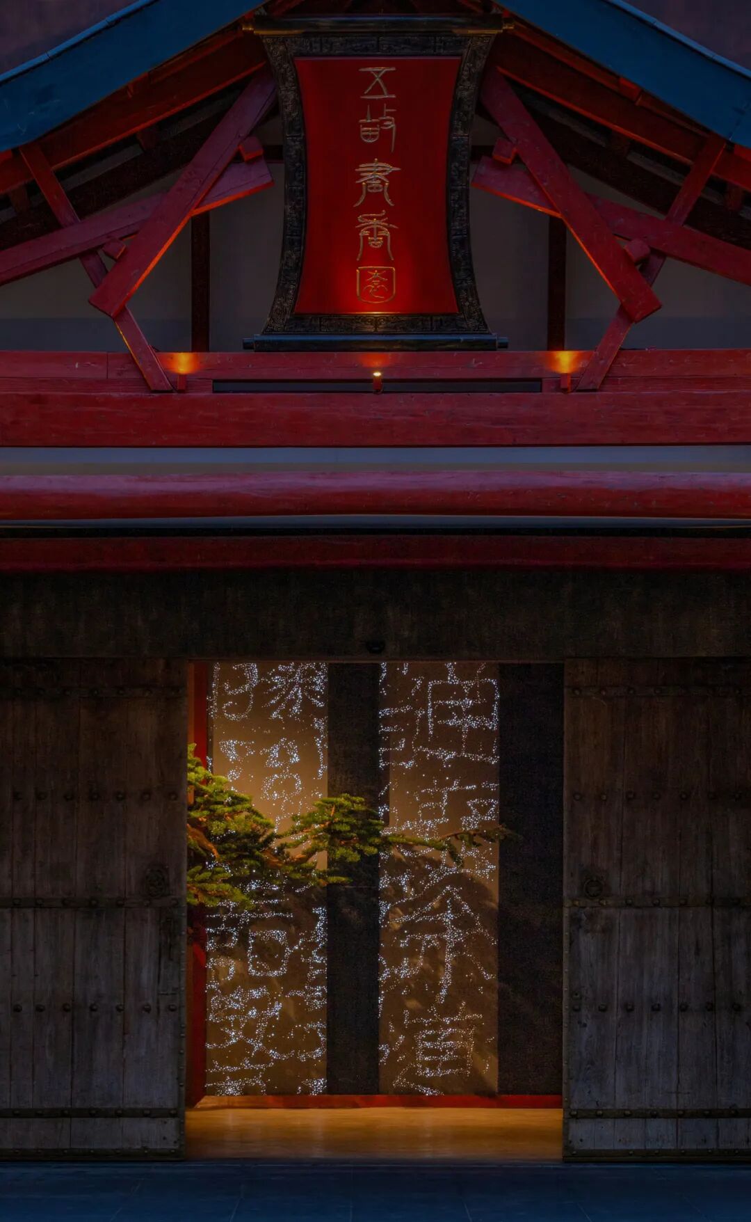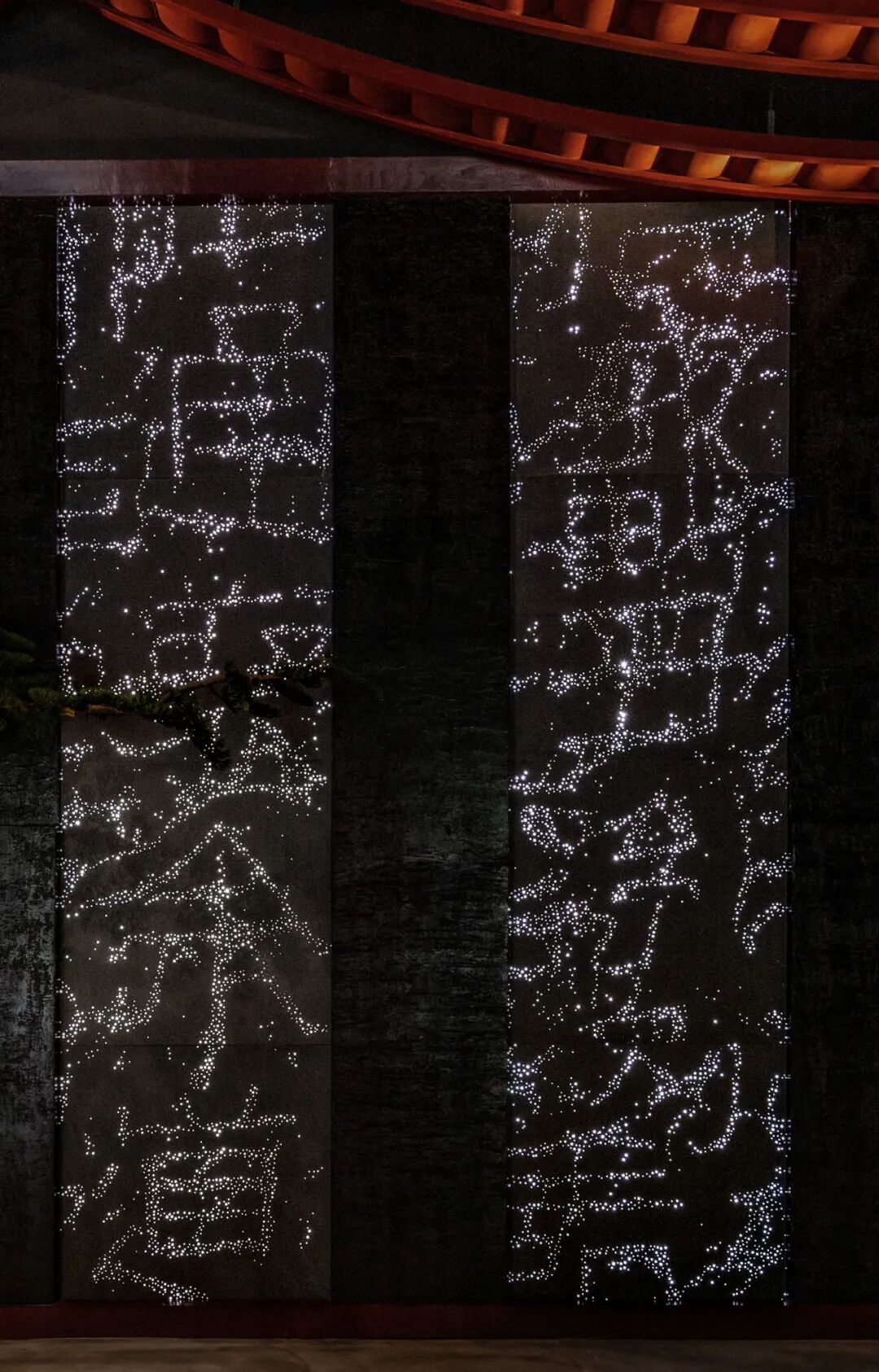 01 入口大堂 灯光透过透光水泥的材质,在墙上展现出 ‘水’的纹理和图腾。这些图腾来自中国汉代的石碑,开通褒斜道刻石。