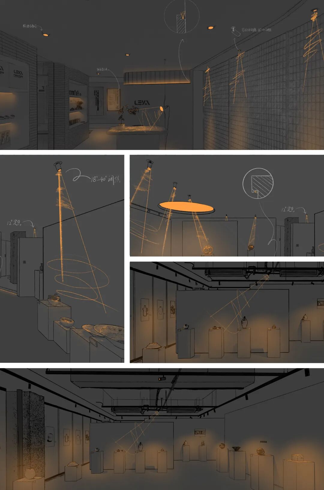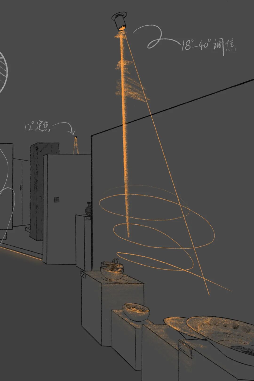 照明设计的核心理念是通过调整光线的角度,使展品在光照下显得更加饱满,避免眩光和阴影对观众造成干扰,优化观赏体验。