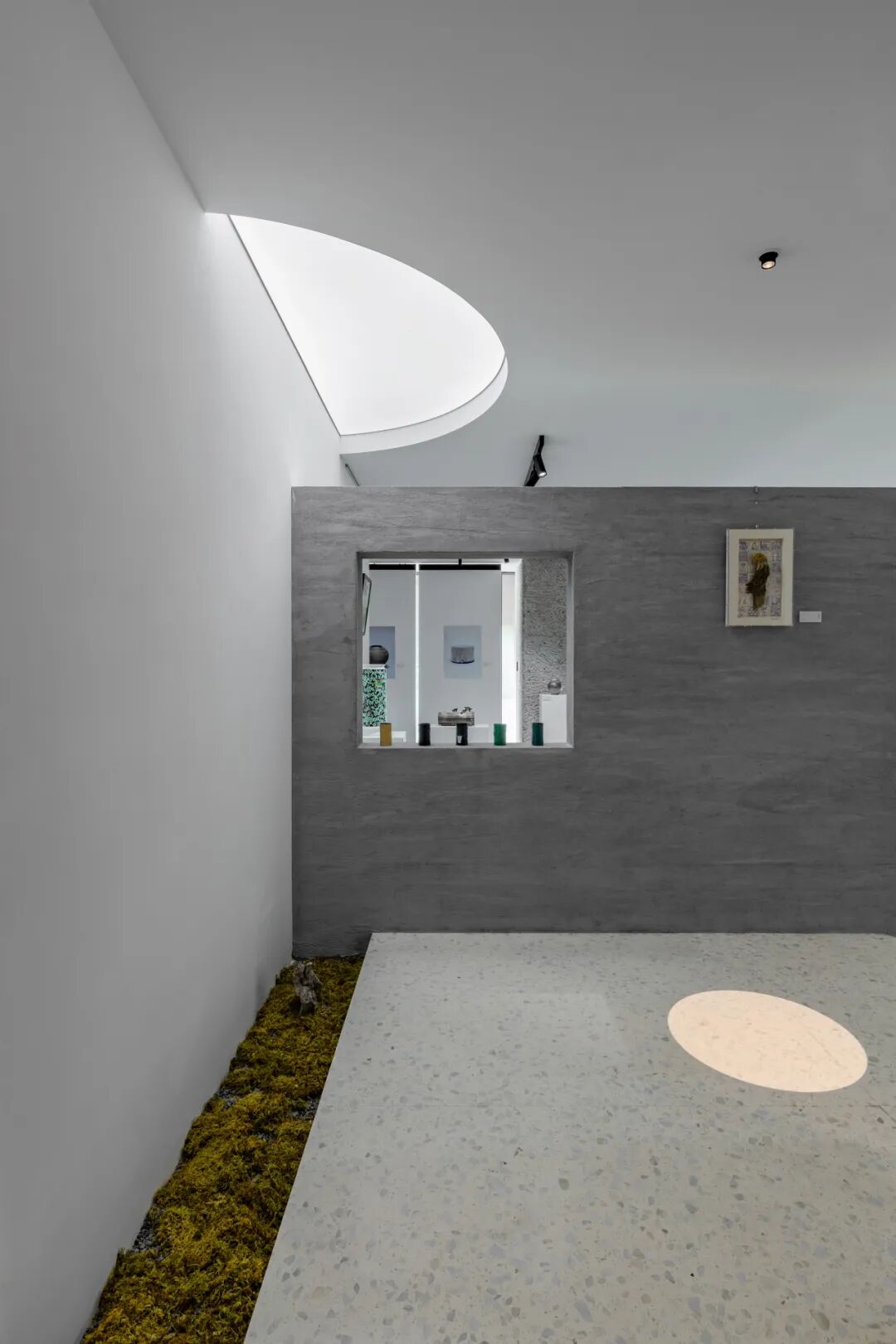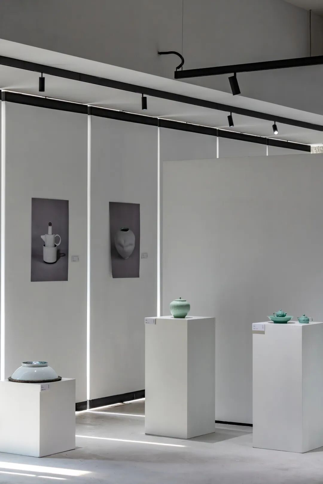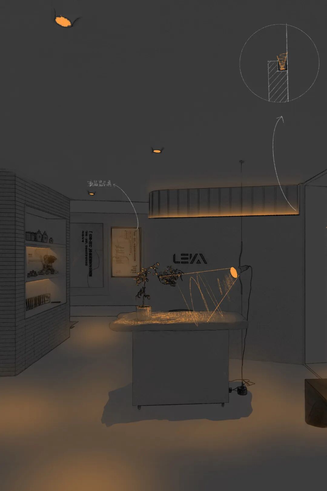 主展厅通过一面可以推开的隔墙,大面积的自然采光提供高亮度环境,同时通过吊线的磁吸轨道,导轨射灯、切光灯进行展品的重点照明。