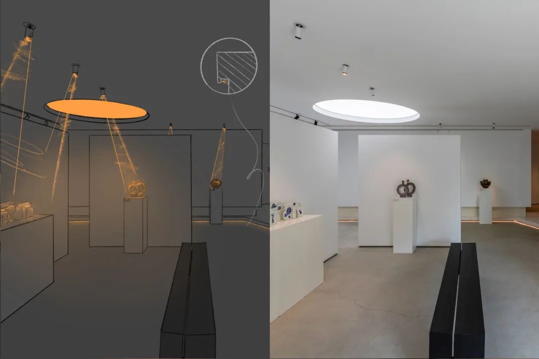 圆形的天花灯膜,为空间提供均匀的漫射光,去除空间装饰给观者带来的视线干扰,还原展品本身的气质,让展品更加凸显艺术魅力。